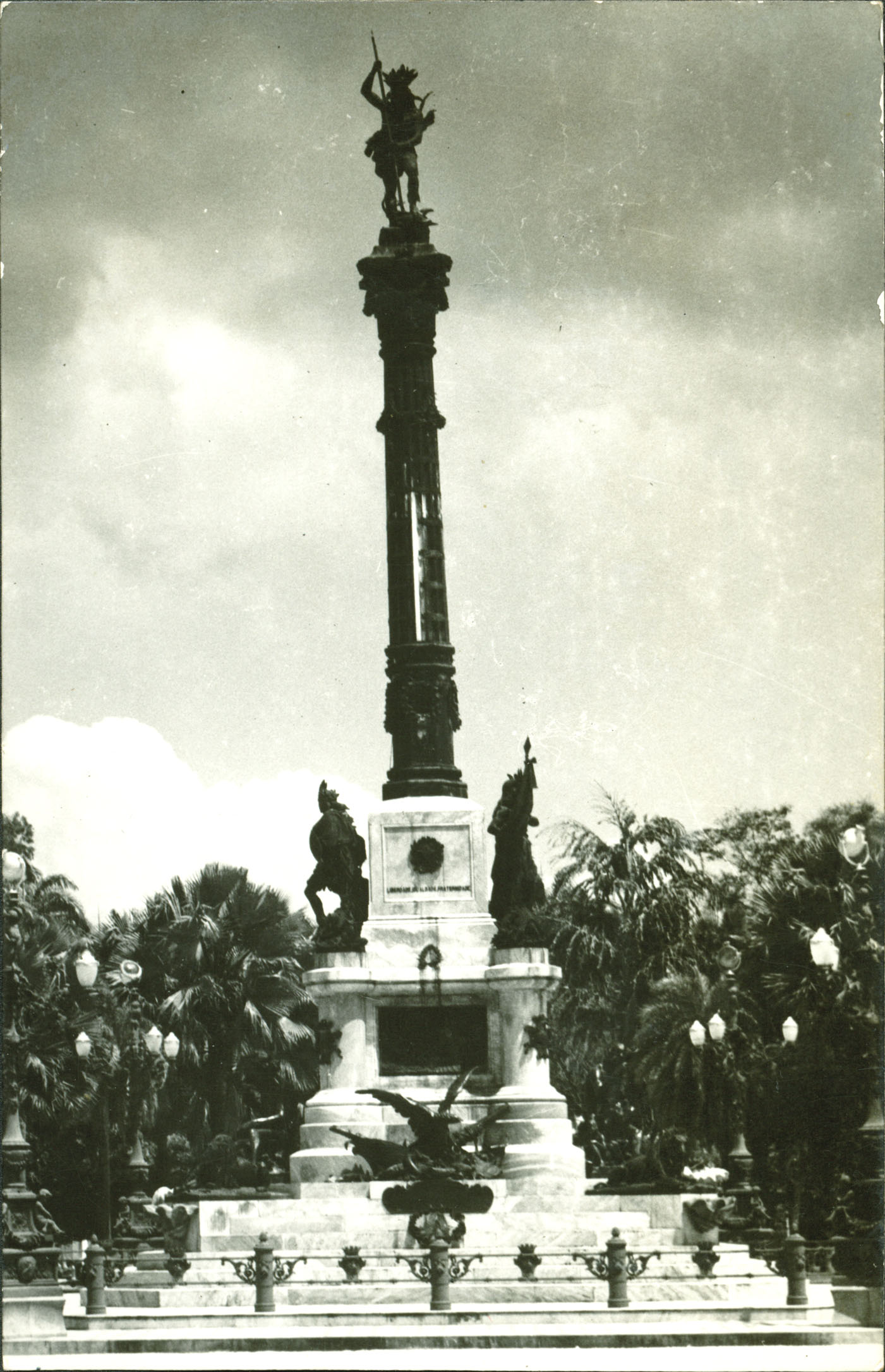 Foi esculpido pelo artista italiano Carlo Nicoli y Manfredi, vice-cônsul do Brasil. Outros artistas italianos também colaboraram. A montagem coube ao engenheiro Antonio Augusto Machado. Tem 25,86 metros de altura e, na época, era o monumento mais alto da América do Sul. Sua coluna é de bronze, em estilo coríntio, sobre um pedestal de mármore de Carrara.