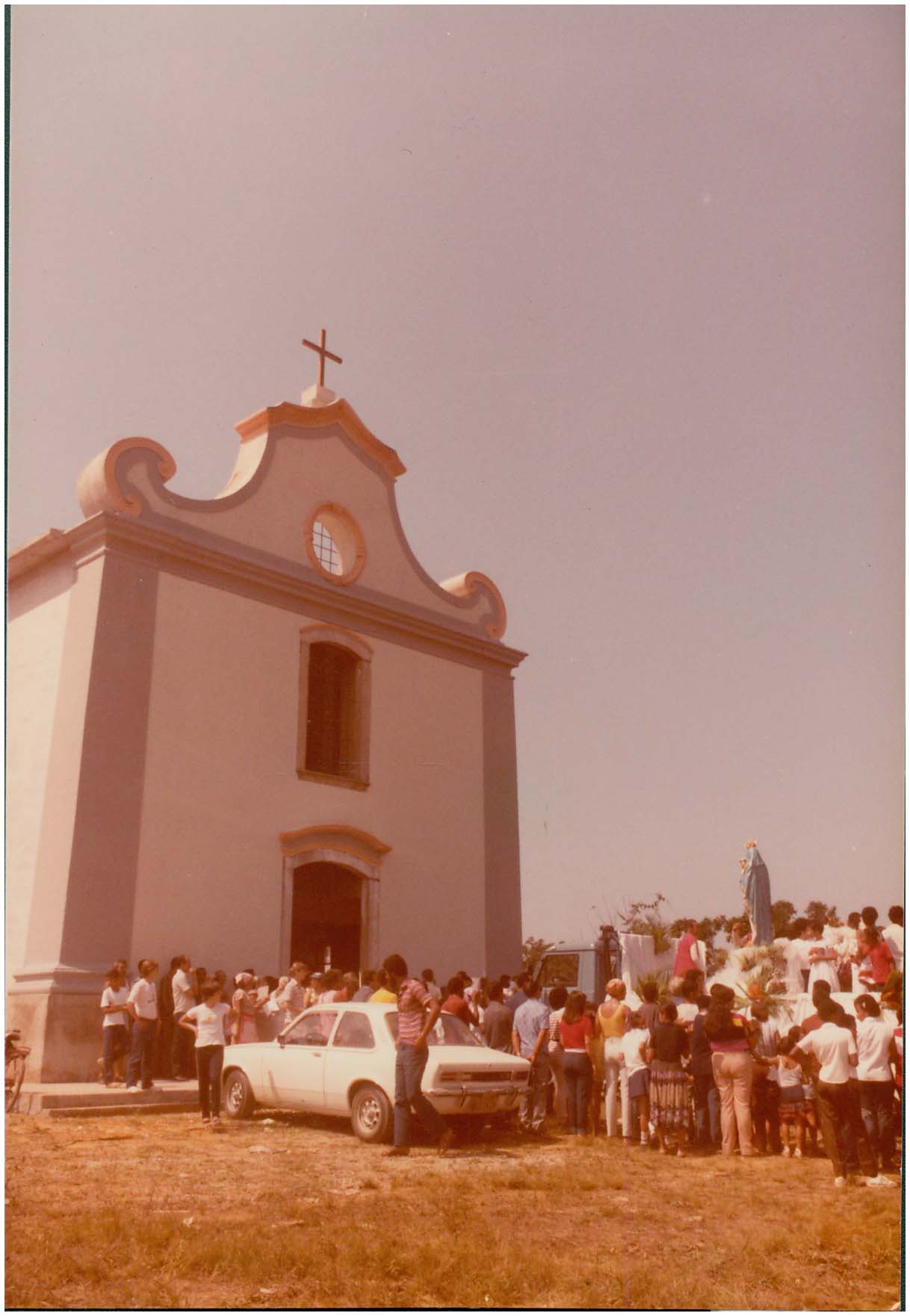 Inscrição na foto: chegada da imagem de Nossa Senhora d'Ajuda na festa de reinauguração da Igreja, em agosto de 1983, após a recuperação das ruínas do templo.