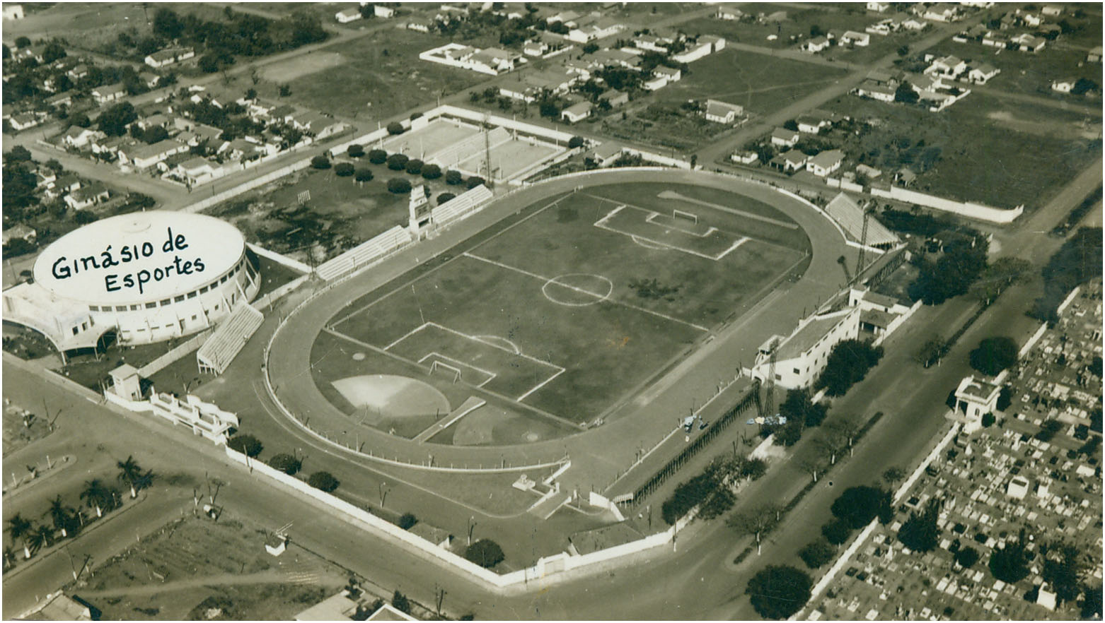 Título: [Vista aérea da cidade : Ginásio Municipal Doutor Plácido Rocha : Estádio Municipal Doutor Adhemar de Barros : Avenida da Saudade] : Araçatuba (SP)