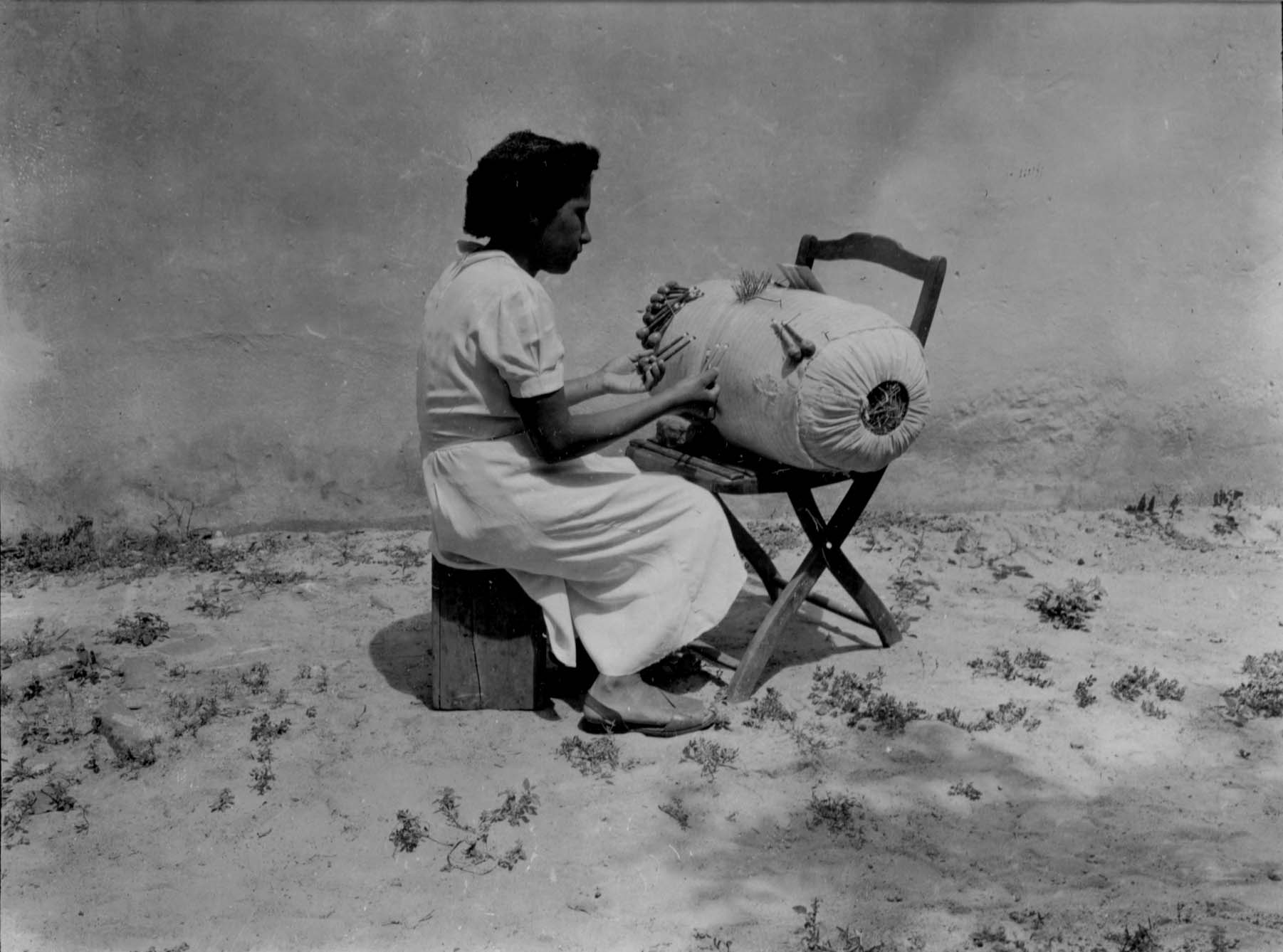 Notas: Negativo 324. Rendeira fazendo rendas com bilros.
