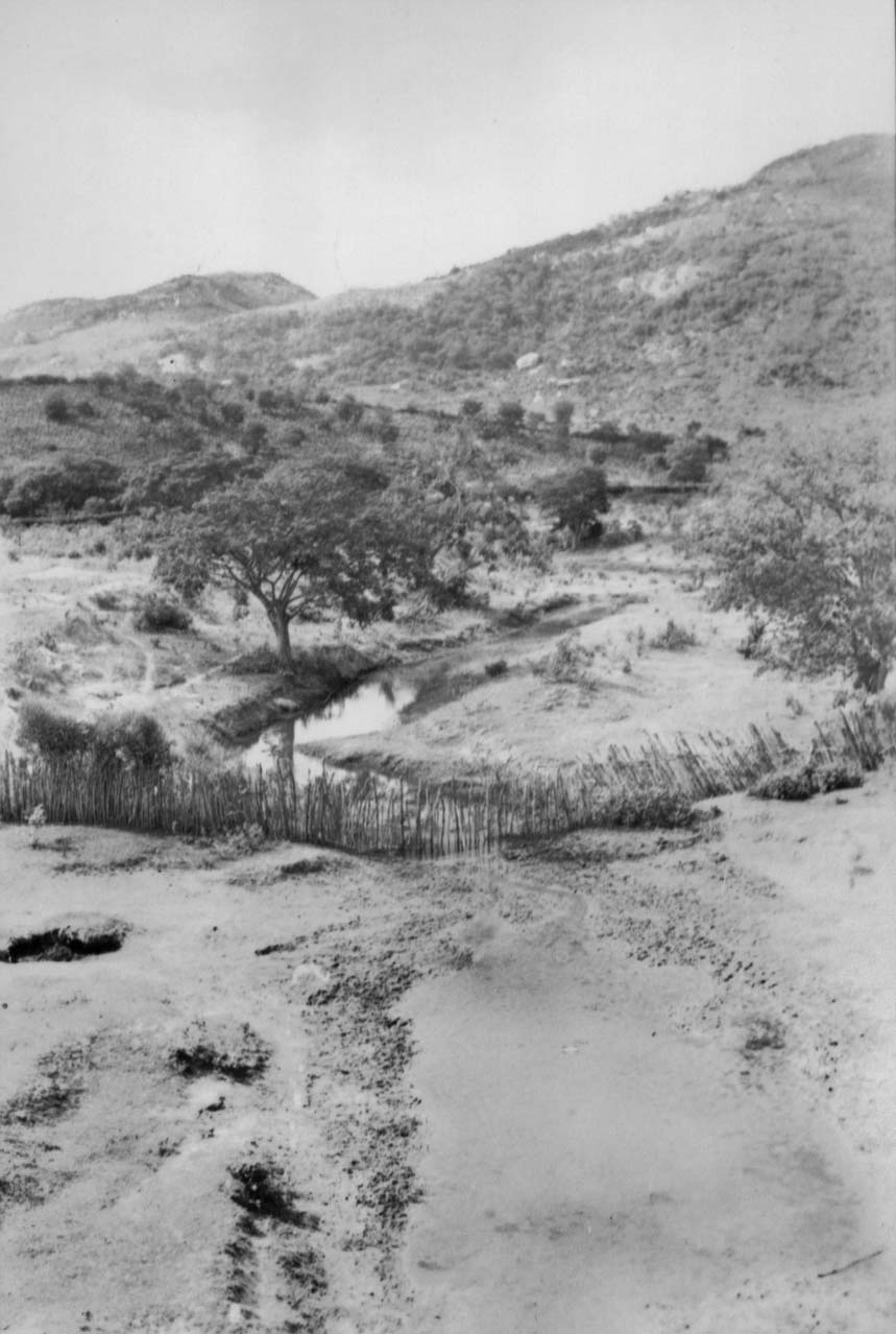 Notas: Negativo 1636. Rio cortado durante a seca com poças de água.