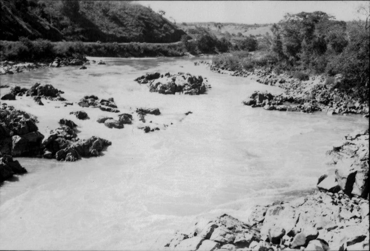 Notas: Negativo 6382. Afloramento de granito diaclasado e afloramento de gnaisse no local da ponte onde há um pequeno salto.