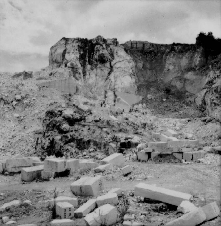 Notas: Negativo 6800. Jazida de mámore (540 ms) a sete quilometros de Mar de Espanha. No topo da jazida existe um barro de cor avermelhada. O mármore é extraido mediante o uso de perfuradores.