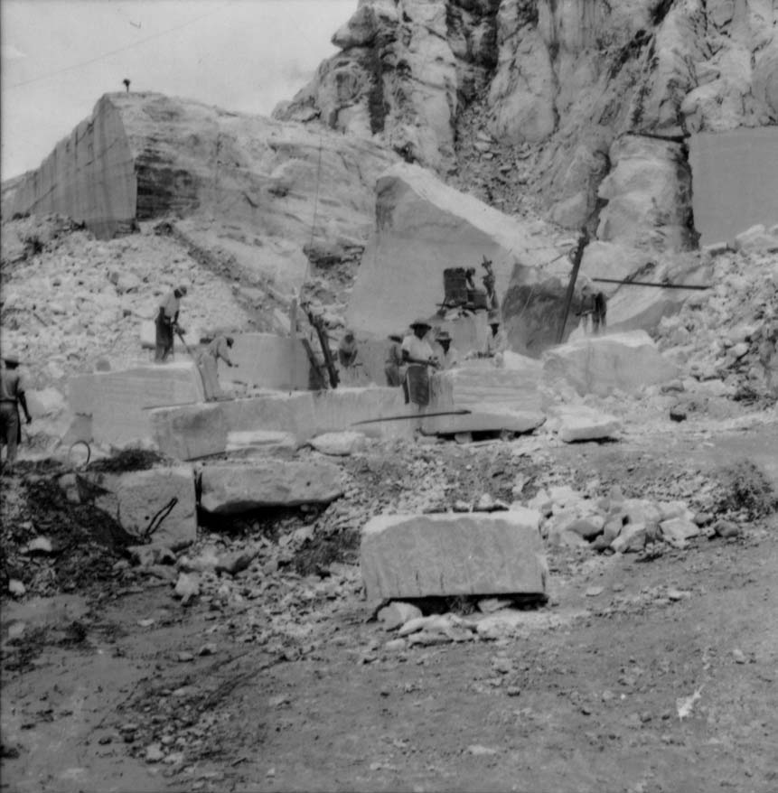 Notas: Negativo 6801. Perfuratrizes mecânicas e serras cortando o mármore nas jazidas.