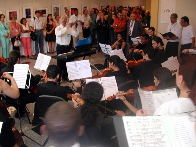 Notas: Apresentação do Coral do IBGE, acompanhado pela Orquestra Livre do Rio de Janeiro, regidos pelo Maestro Marcio Luiz de Carvalho, no hall do auditório Teixeira de Freitas, no CDDI.