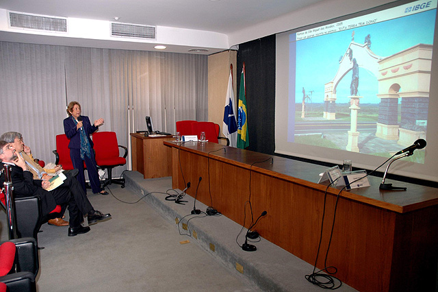Notas: Maria Luisa Gomes Castello Branco(Coordenadora de Geografia) faz exposição do Atlas das Representações Literárias no auditório do CDDI. Na platéia Luiz Fernando Pinto Mariano(Diretor de Informática) e David Wu Tai(Coordenador Geral do Centro de Documentação e Disseminação de Informações)