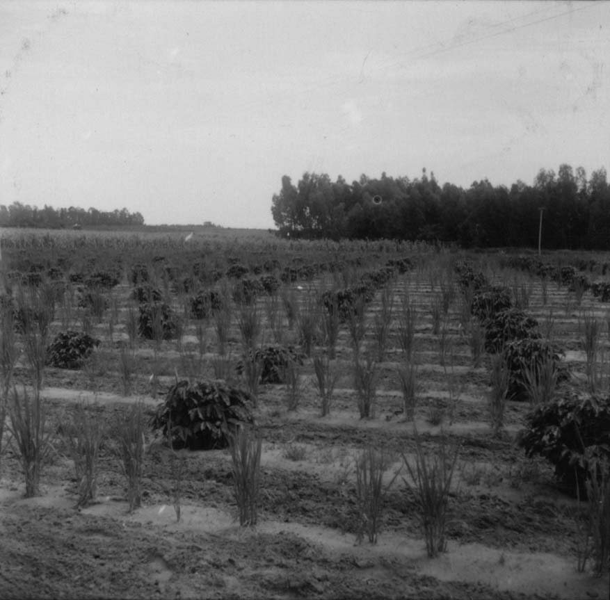 Título: Cafezal novo associado ao arroz; ao fundo, reflorestamento : Município de Marcondésia (SP)