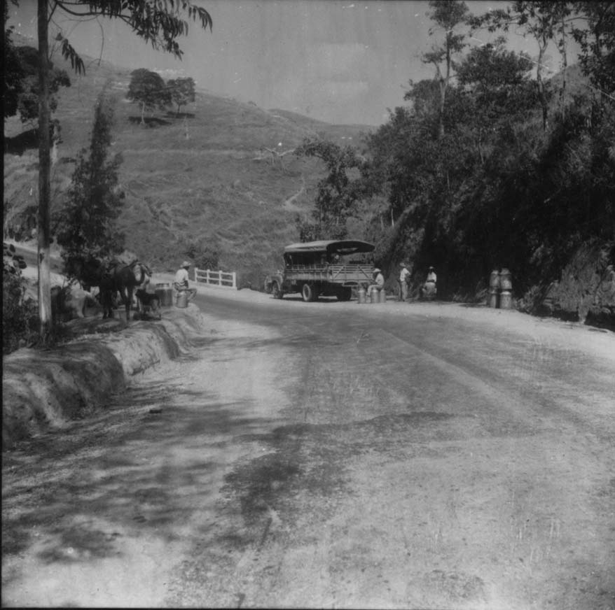 Título: Estrada : caminhões apanhando leite na estrada : ve-se, também, os cavalos e as carretas de bois que fazem o transporte do leite da fazenda até a estrada : Rodovia São José dos Campos/Monteiro Lobato (SP)
