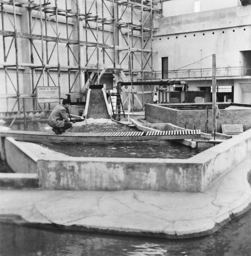Título: Laboratório de hidráulica da Escola Politécnica da Universidade de São Paulo : modelo da barragem de Chavantes : detalhe da descida do canal vertedor (SP)