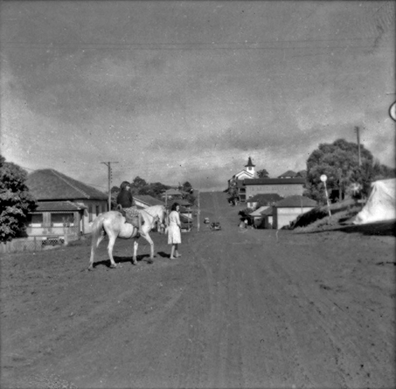 Assuntos: Cavalo; Cidades e vilas; Dionísio Cerqueira (SC); Estradas de terra; Habitações; Mulheres; Ruas; Santa Catarina
