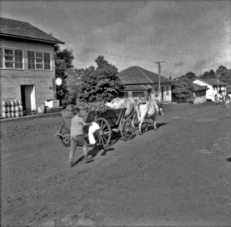 Assuntos: Bovino; Carroças; Construção de madeira; Dionísio Cerqueira (SC); Estradas de terra; Pessoas; Santa Catarina
