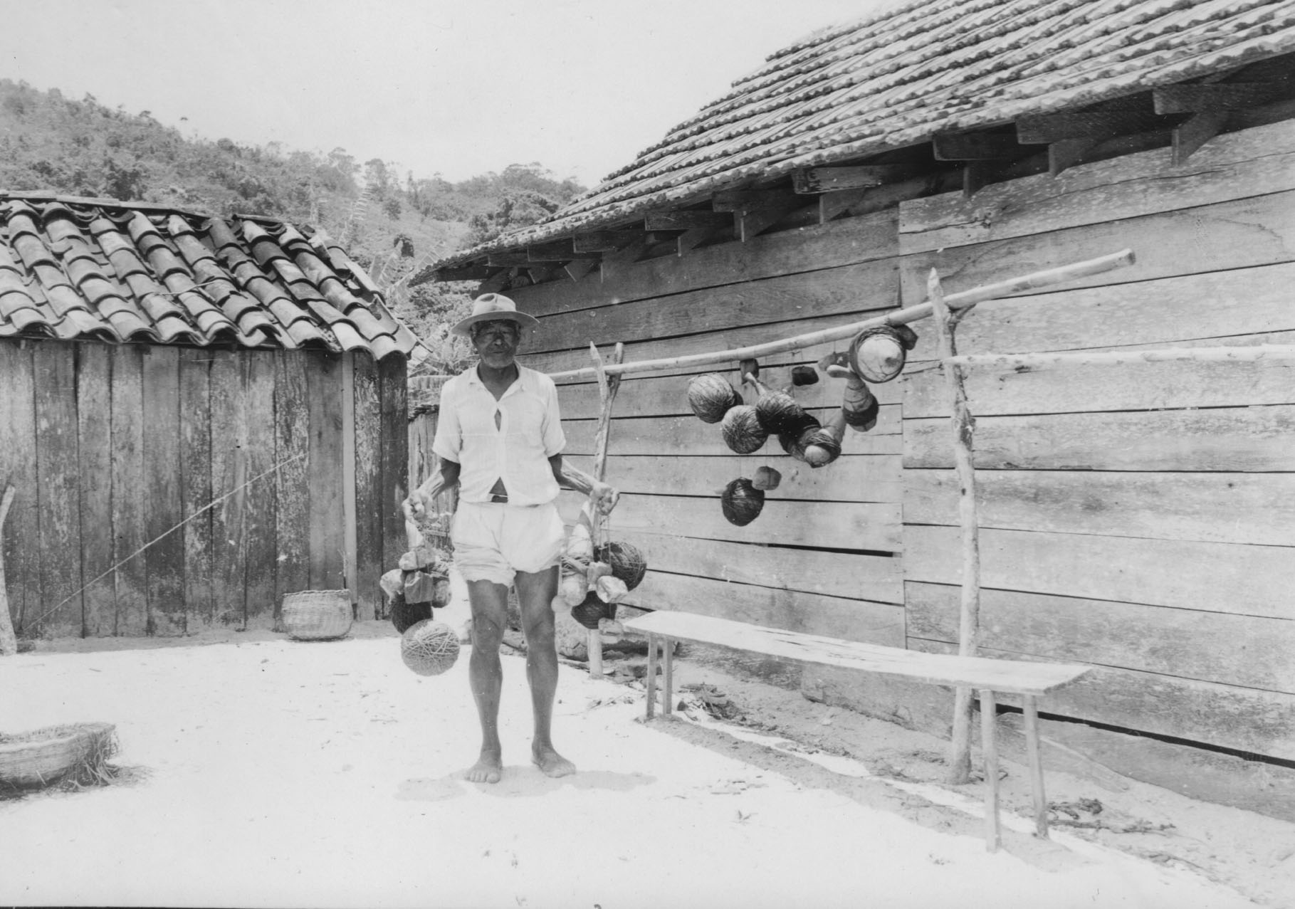 Assuntos: Cestas; Construção de madeira; Pesca; Pessoas; Porto Belo (SC); Santa Catarina