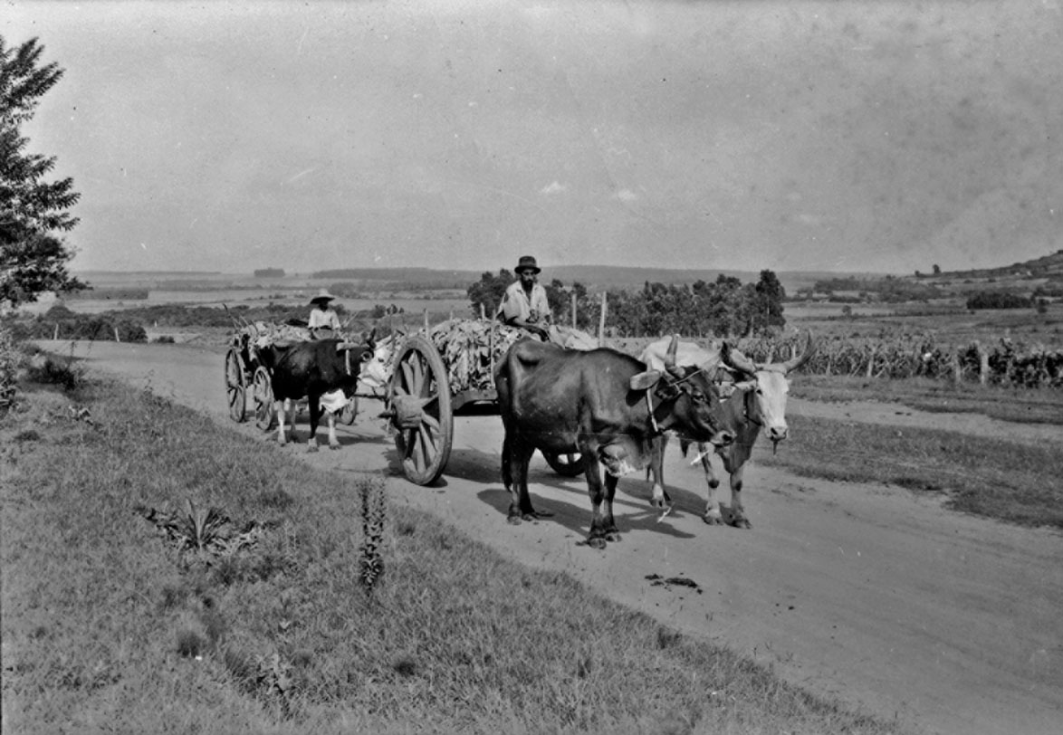 Assuntos: Carroças; Estradas de terra; Fumo; Pessoas; Rio Grande do Sul; Vegetação e clima