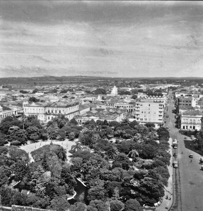 Assuntos: Automóveis; Edifícios comerciais; Pelotas (RS); Pessoas; Praças; Rio Grande do Sul; Ruas; Vegetação e clima; Vistas panorâmicas