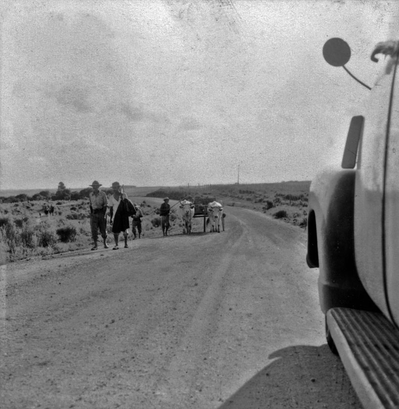 Assuntos: Automóveis; Bagé (RS); Carro de bois; Estradas de terra; Pessoas; Rio Grande do Sul; Vegetação e clima