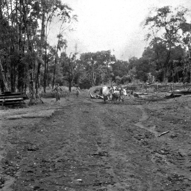 Título: Junta de bois arrastando troncos : gramado. Município de Palmeira (RS)