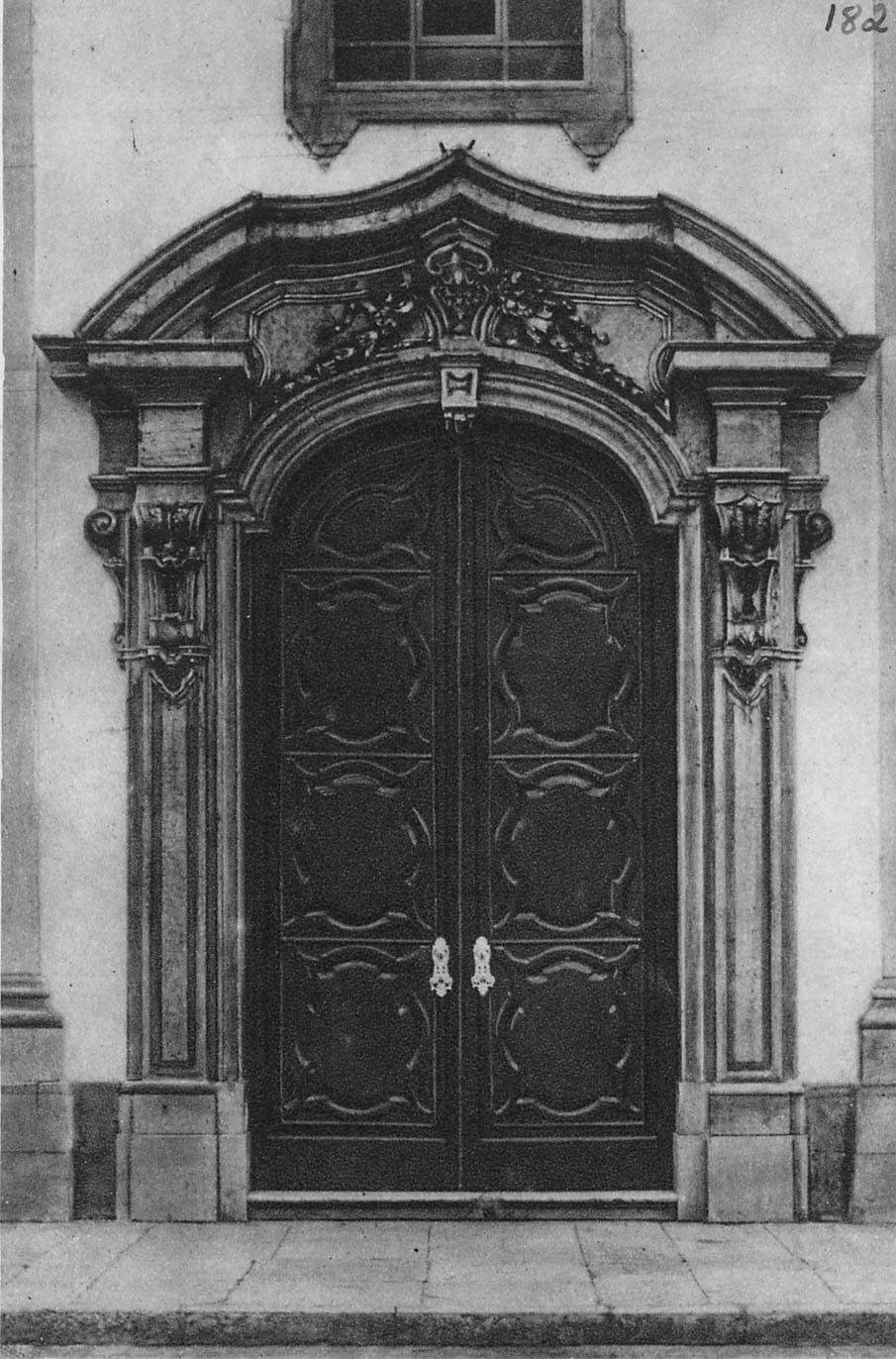 Inscrição na foto: Porta principal da Catedral de Belém, Pará, em madeira de lei e moldura de lioz esculpida em artístico rendilhado; aldrabas de bronze.