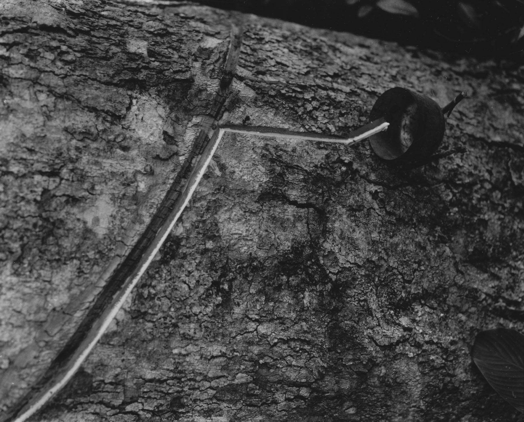 Título: Seringueira, vendo-se o corte e a caneca na Fazenda Rio Novo (MT)