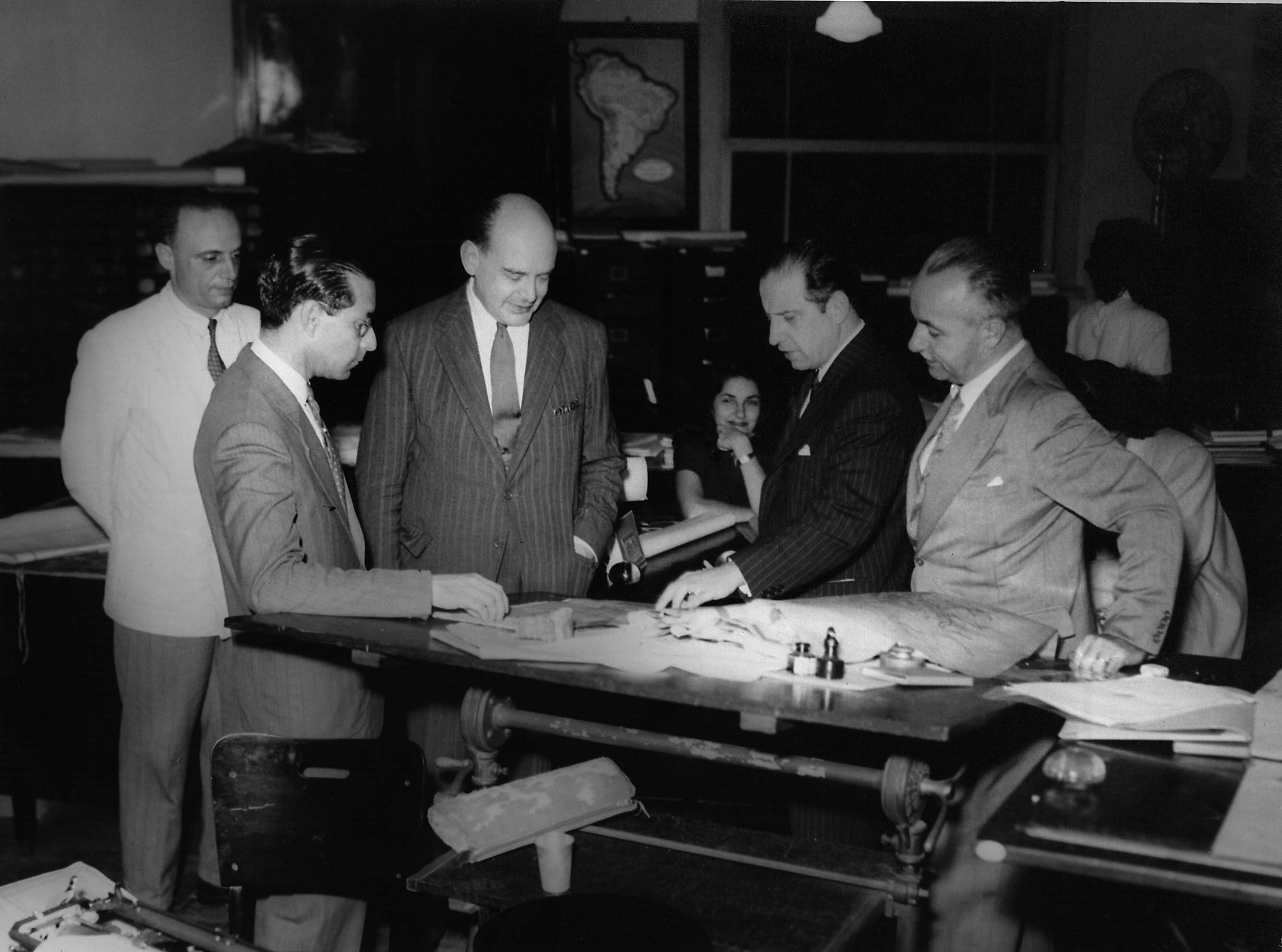 Notas: Visita do Embaixador da Colômbia, Sr. Francisco Umoña Bernal, ao Conselho Nacional de Geografia - CNG. Da esquerda para direita Antônio José de Matos Musso é o 1º. Da esquerda para direita Lafayette Pereira Guimarães é o 2º. Da esquerda para direita Francisco Umoña Bernal é o 3º. Da esquerda para direita Christovam Leite de Castro é o 4º. Da esquerda para direita Francis Ruellan é o 5º.