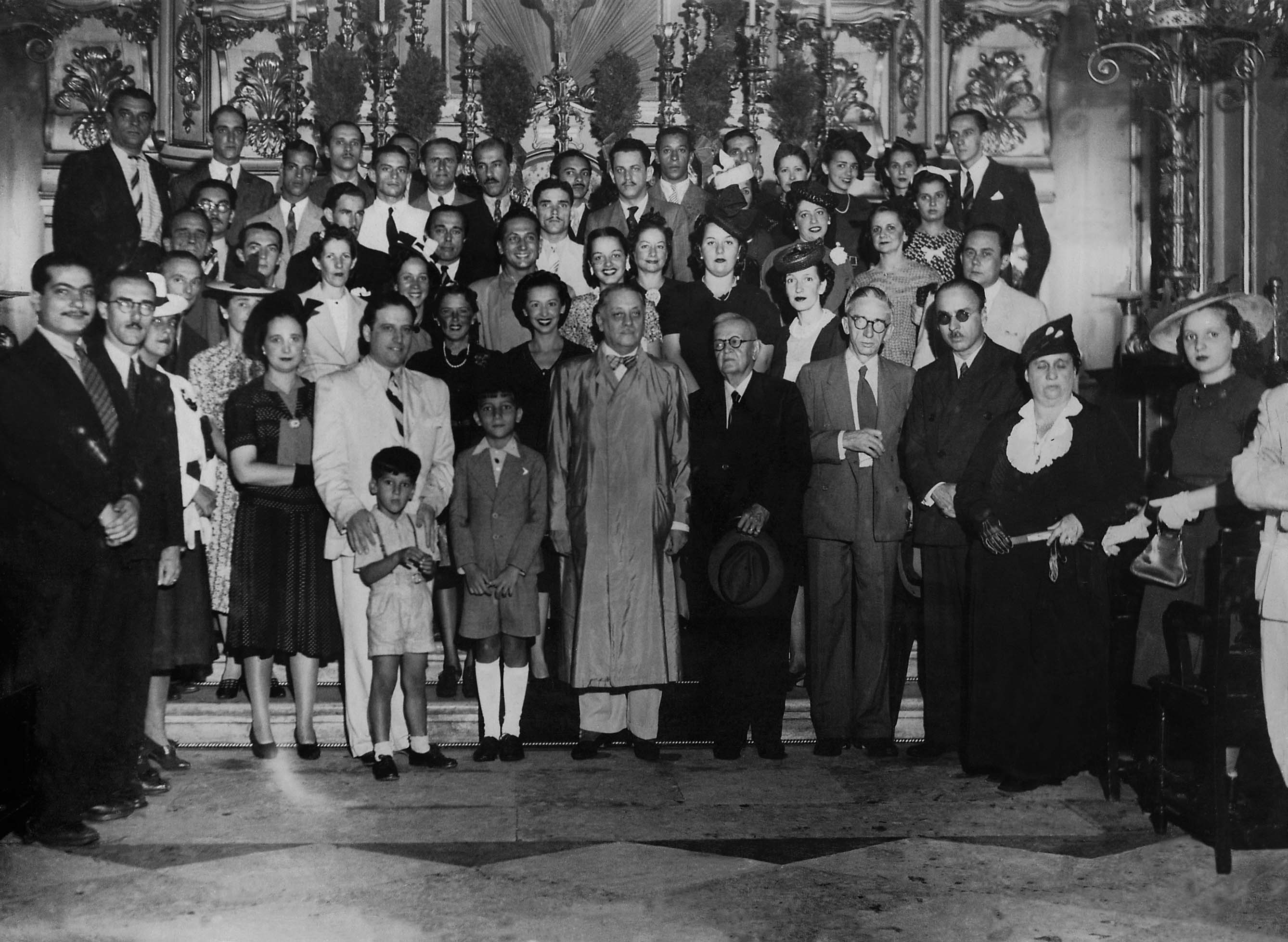 Notas: Missa comemorativa do 3º aniversário de criação do Conselho Nacional de Geografia (CNG). Da esquerda para direita, na primeira fileira, Jorge Zarur é o 1º. Da esquerda para direita, na primeira fileira, Fábio de Macedo Soares é o 2º. Da esquerda para direita, na primeira fileira, Christovam Leite de Castro é o 5º. Da esquerda para direita, na primeira fileira, José Carlos de Macedo Soares é o 6º. Da esquerda para direita, na primeira fileira, Allyrio Hugueney de Mattos é o 8º. Da esquerda para direita, na primeira fileira, Mário Augusto Teixeira de Freitas é o 9º.
