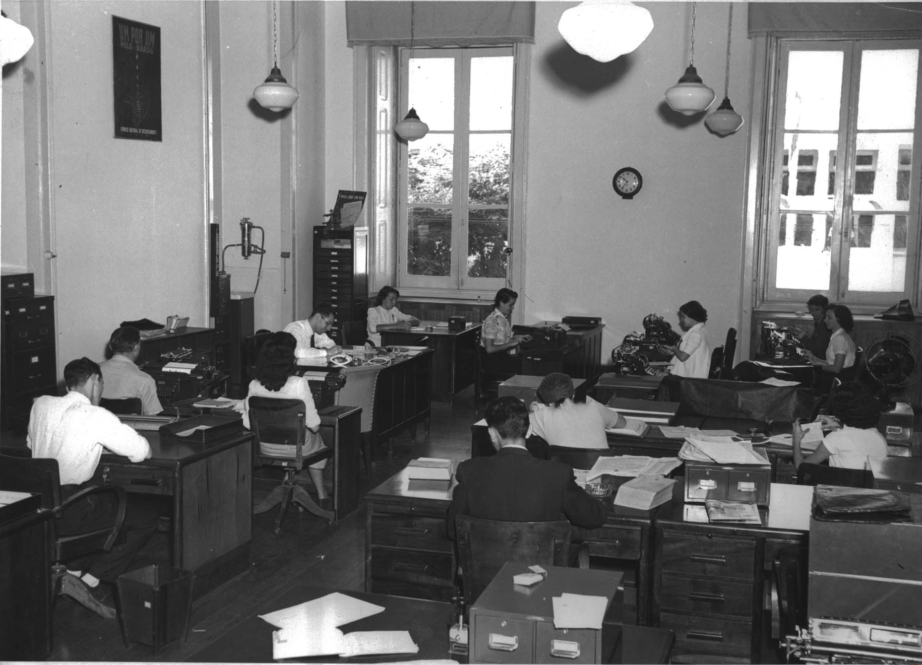 Notas: Na fotografia, o chefe do setor Ernani Villasboas de Figueiredo, de camisa e gravata, está sentado à frente dos funcionários. Vê-se parte do antigo prédio do Serviço Nacional de Recenseamento.