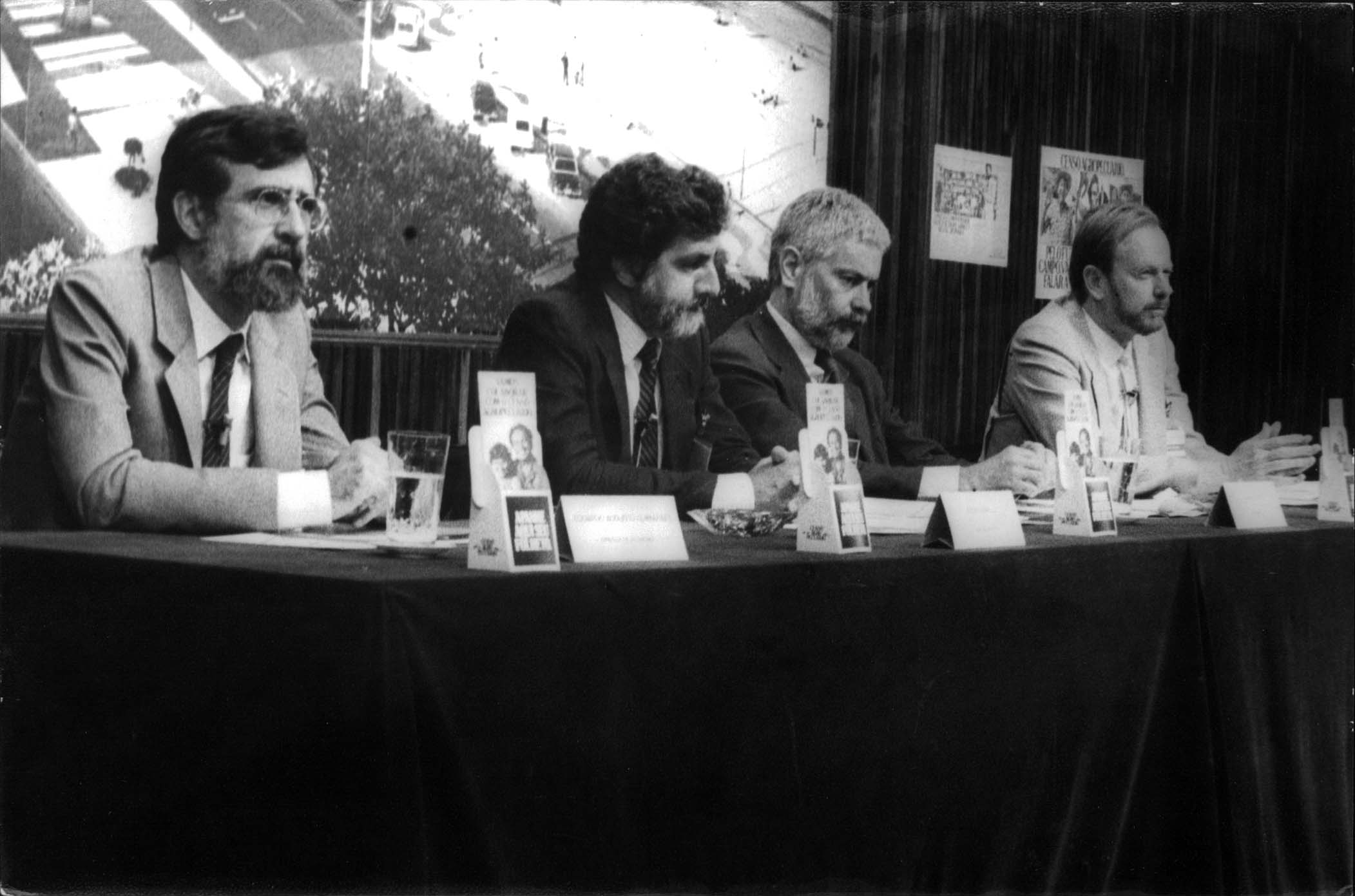 Notas: Da esquerda para direita, Eduardo Augusto Guimarães (1º), Regis Bonelli (2º), Edmar Lisboa Bacha (3º) e Charles Curt Mueller (4º) concedendo entrevista coletiva por ocasião do lançamento dos censos econômcos de 1985 no auditório da Embratel, Rio de Janeiro.