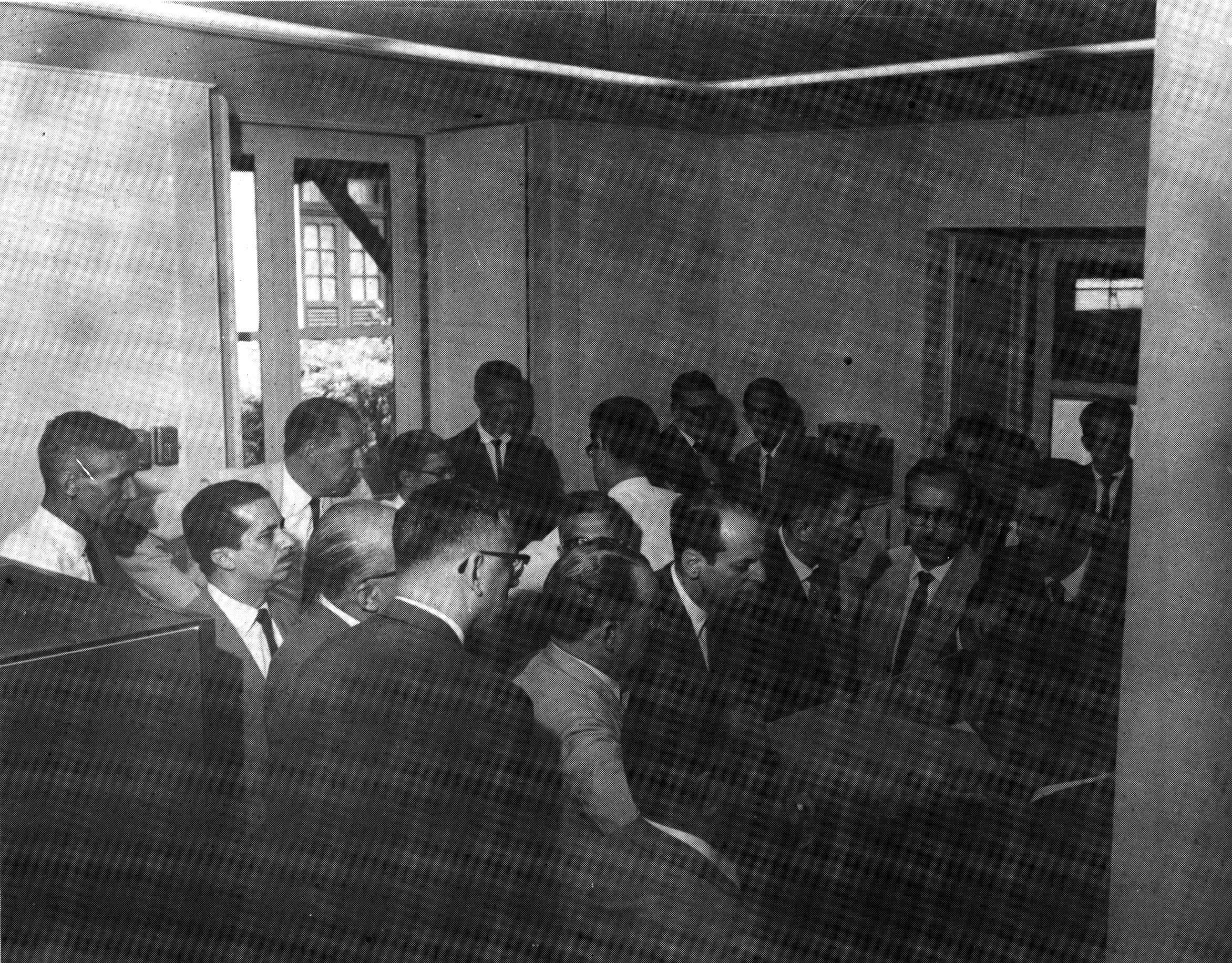 Notas: Entre os presentes,vê-se, à frente na primeira fileira,da esquerda para direita, Elson Mattos (4º) e Ovídio de Andrade Júnior (6º). Na quarta fileira ao fundo, da esquerda para direita, Rudolf Walter Franz Wünsch (2º) e Martiniano Barbosa Moreira (4º), Superintendente do Centro de Processamento de Dados do Serviço Nacional de Recenseamento. Acervo particular de Elson Mattos doado ao Setor de Memória Institucional.
