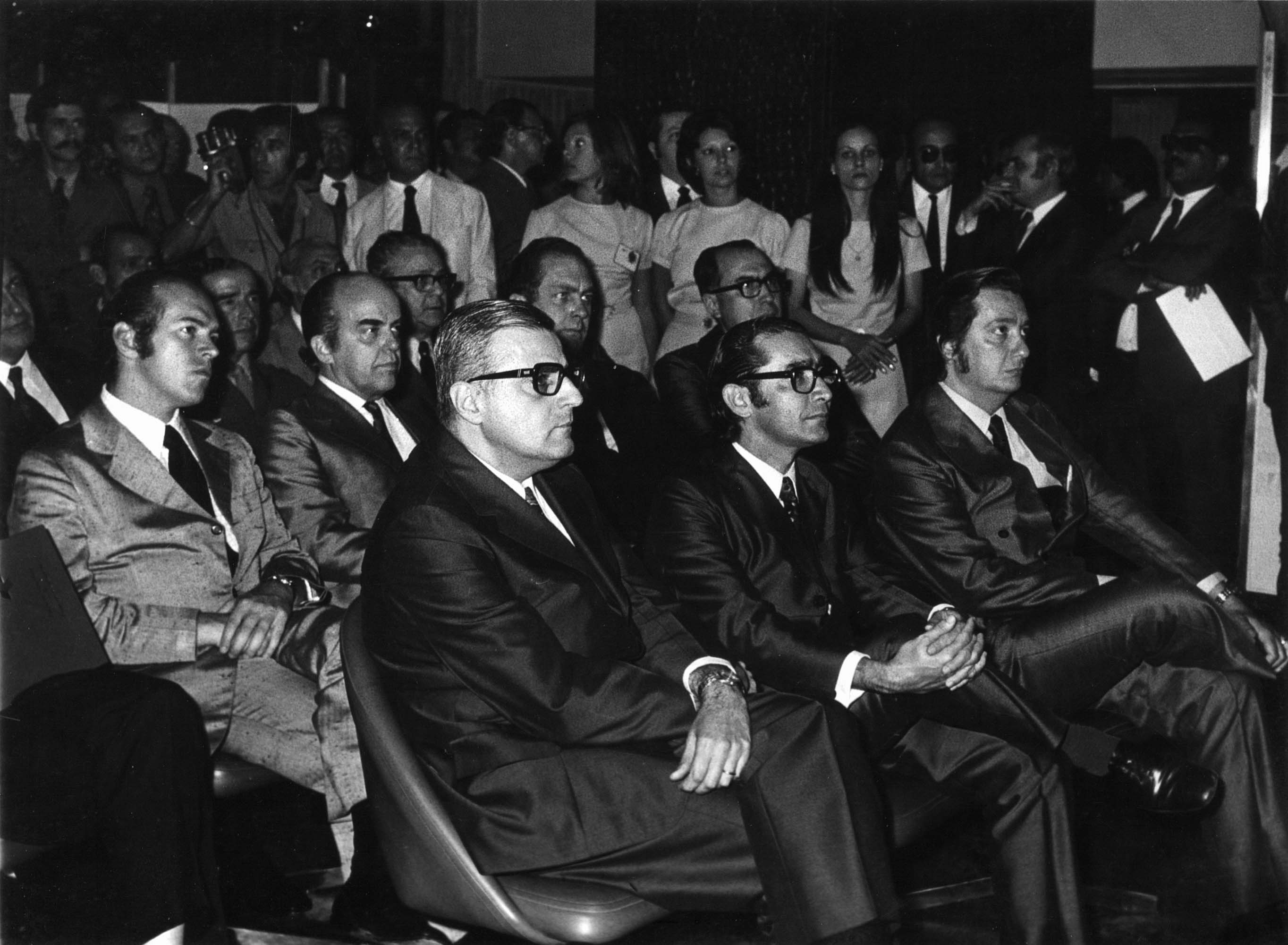 Notas: A II Conferência Nacional de Estatística, Geografia e Cartografia, em 1972, deu-se na Escola Nacional de Ciências Estatísticas (ENCE). Na plateia, em primeiro plano, da esquerda para direita, o ex-Presidente do IBGE Isaac Kerstenetzky (1º) e o ex-Ministro do Planejamento João Paulo dos Reis Velloso (2º).