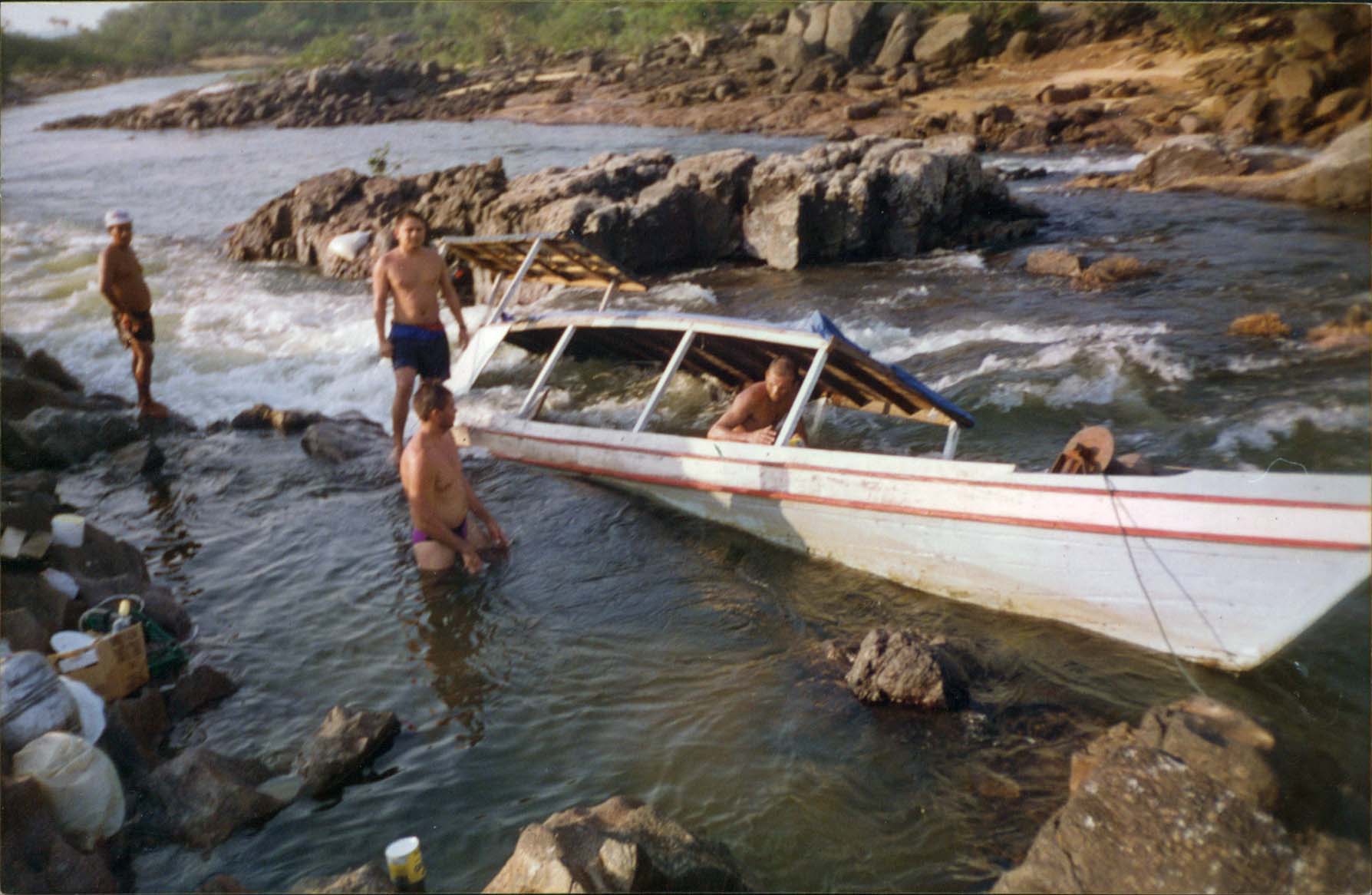 Notas: Grupo de recenseadores fazendo travessia de barco no Rio Iriri e se desviando da Cachoeira do Amaro Velho, Belém do Pará.