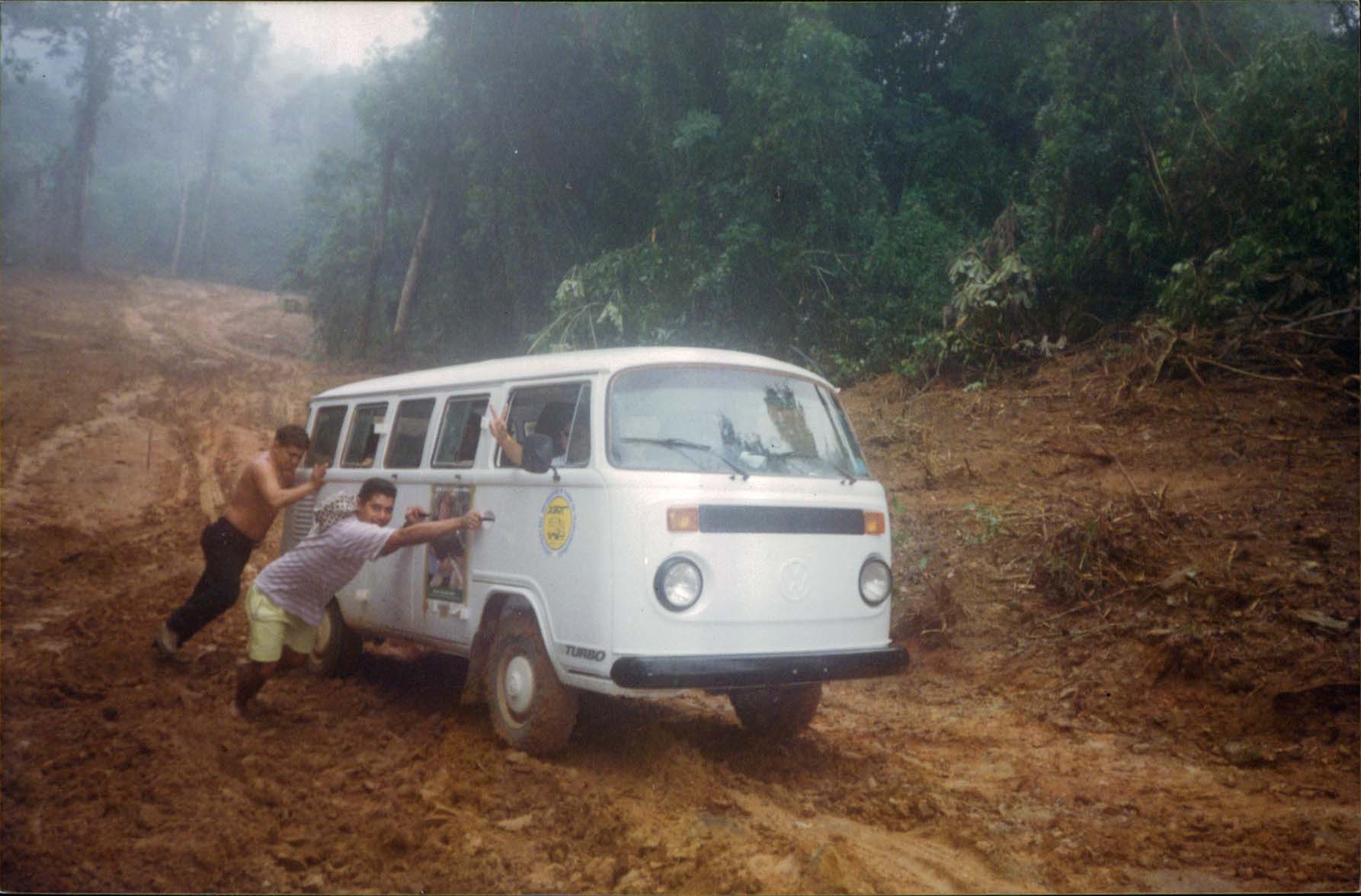 Notas: Grupo de recenseadores empurrando veículo na estrada do garimpo Manelão, em Belém do Pará.