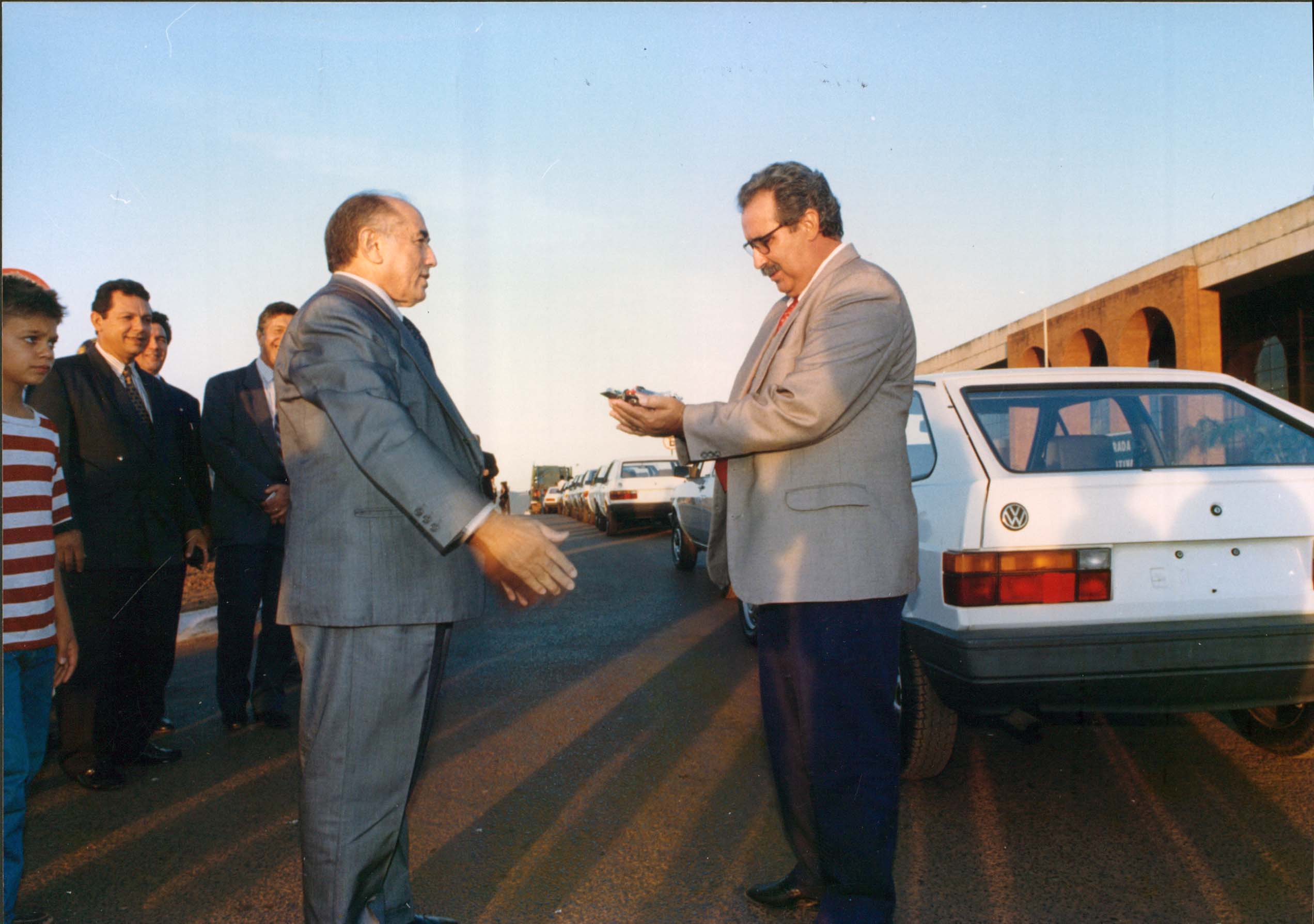 Notas: Em destaque, Lenildo Fernandes Silva, à direita, recebe do governador do Tocantins, José Wilson Siqueira Campos (1995-1998), à esquerda, as chaves dos veículos cedidos para o censo de 1996.