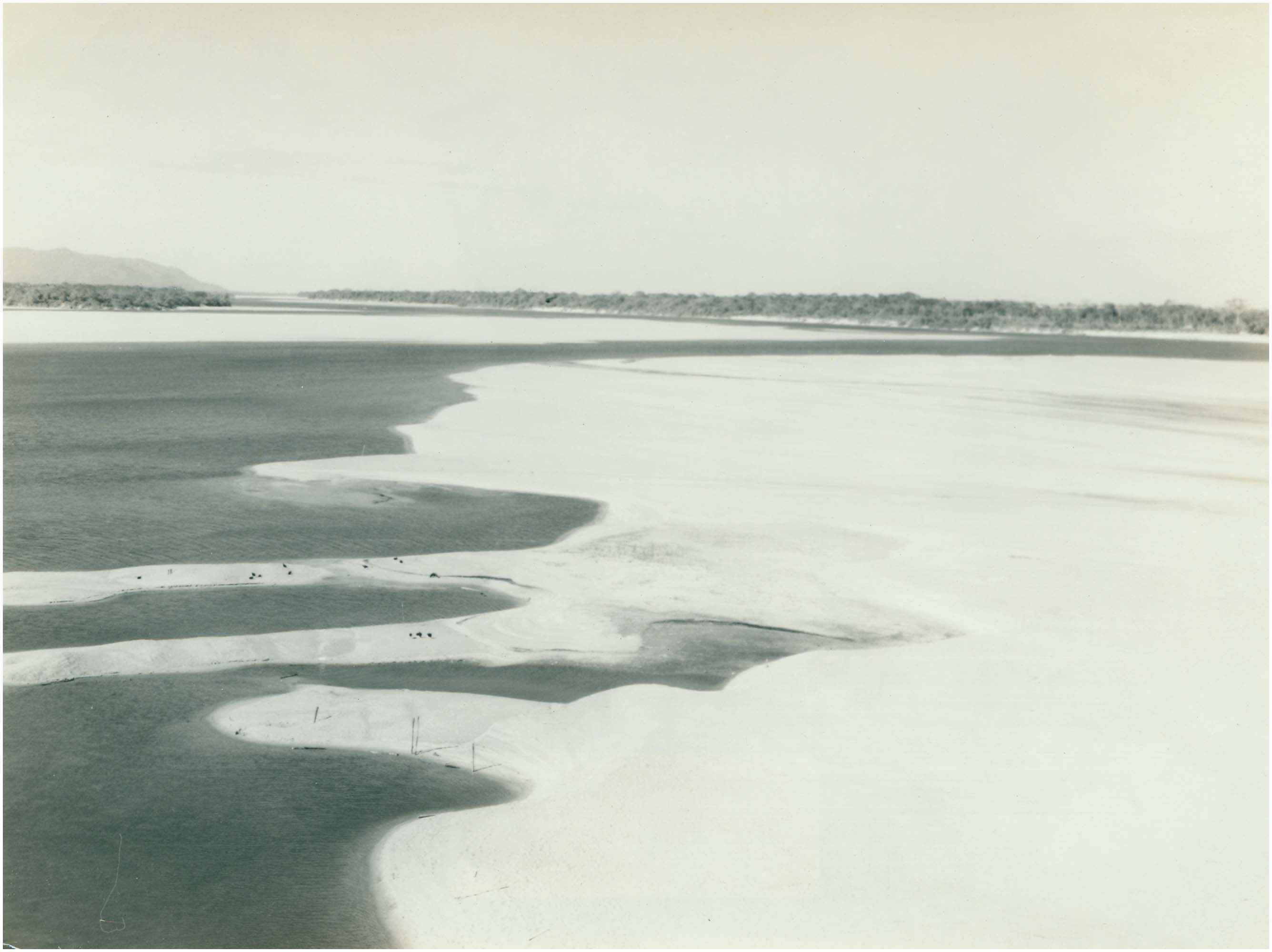 Inscrição na foto: Vista do Rio Branco na vazante, tomada da Ponte dos Macuxis (em Boa Vista) para jusante (direção SSW). Notar a planície sedimentar e, ao fundo, a Serra Grande.