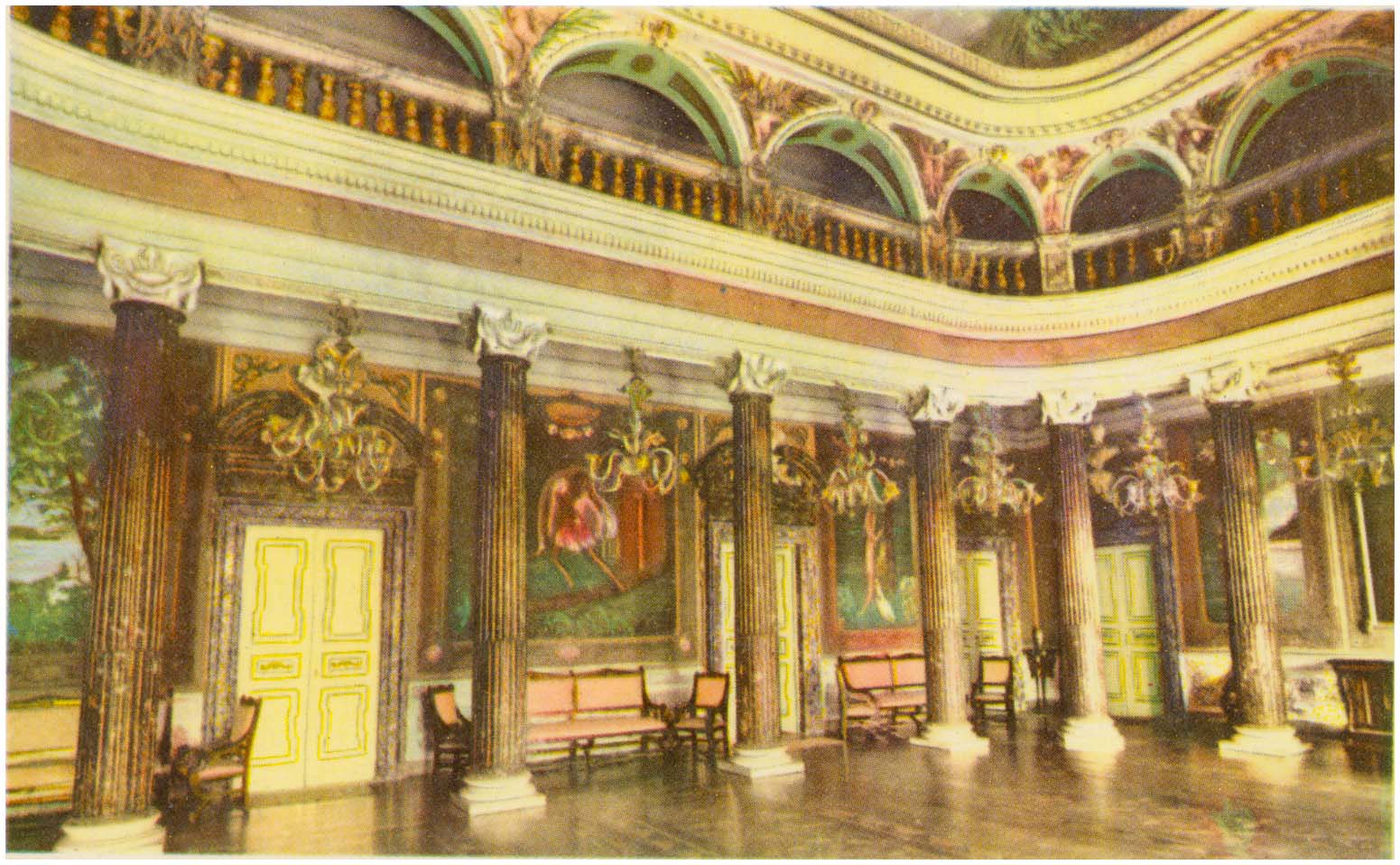 Notas: Salão Nobre do Teatro Amazonas. Espaço destinado a dança após espetáculos, possui 12 mil pedaços de madeiras nobres como Pau-brasil, jacarandá, pau-marfim, pinho de riga e carvalho que são apenas encaixados sem prego ou cola. As paredes são decoradas com telas de linho lonado. Nelas estão presentes a fauna, a floresta amazônica e imortais da literatura e músicas brasileiras. O teto foi a última obra a ser concluída, denominada de \"A Glorificação das Bellas Artes na Amazônia\", de 1899. Trata-se de uma pintura em perspectiva do artista Domenico de Angelis que levou dois anos para ficar pronta.