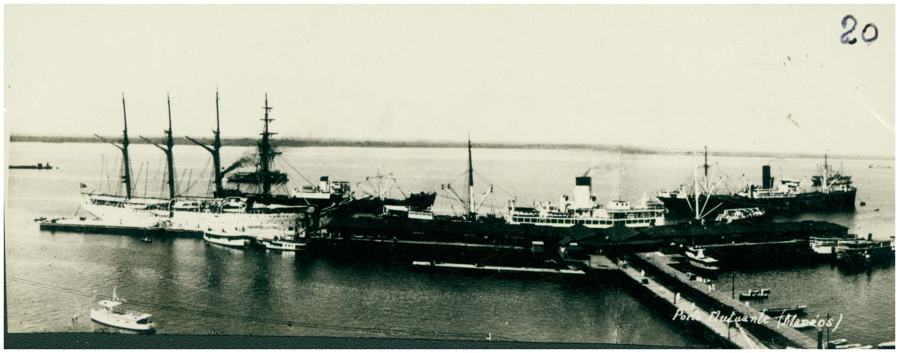 Notas: Atual Porto de Manaus, também conhecido como Porto Flutuante ou Cais Flutuante. Inaugurado em 1907 e considerado o mais original do Brasil. O porto foi construído em um cais flutuante que acompanha o nível das águas do Rio Negro, em épocas de grande cheias. Situado entre a praia de São Vicente e a rampa do Mercado Municipal Adolpho Lisboa. O Cais Flutuante compõe-se de duas partes distintas: a primeira em forma de um T, serve para a atracação de navios de cabotagem. A segunda parte é o trapiche que liga as balsas flutuantes à ponte móvel. O porto passou a ser o principal ponto turístico da época e recebia navios de luxo da Lamport, da Boat Line e outros. Também saiam do Porto de Manaus embarcações com borracha, castanha, madeira, produtos de exportação da época.
