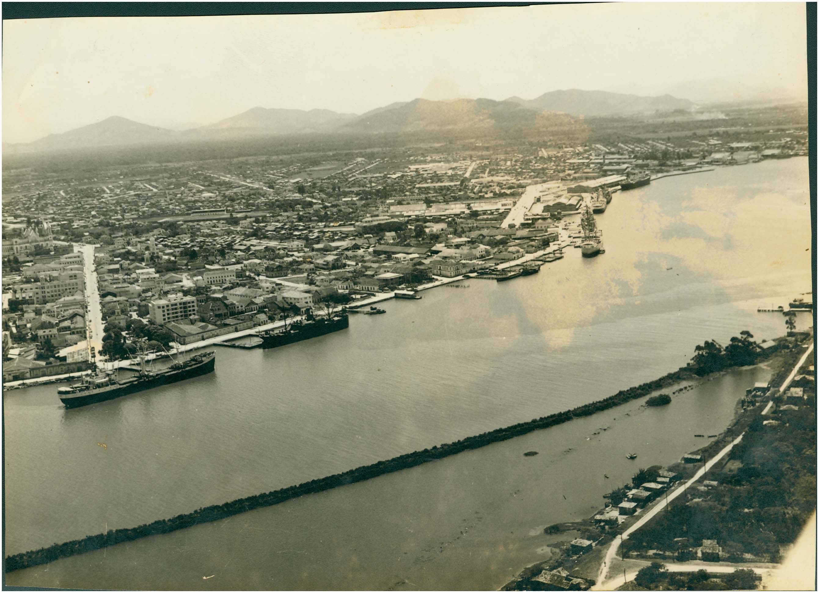 Assuntos: Cais; Cidades e vilas; Habitações; Itajaí (SC); Portos; Rios; Santa Catarina; Vistas aéreas; Vistas panorâmicas