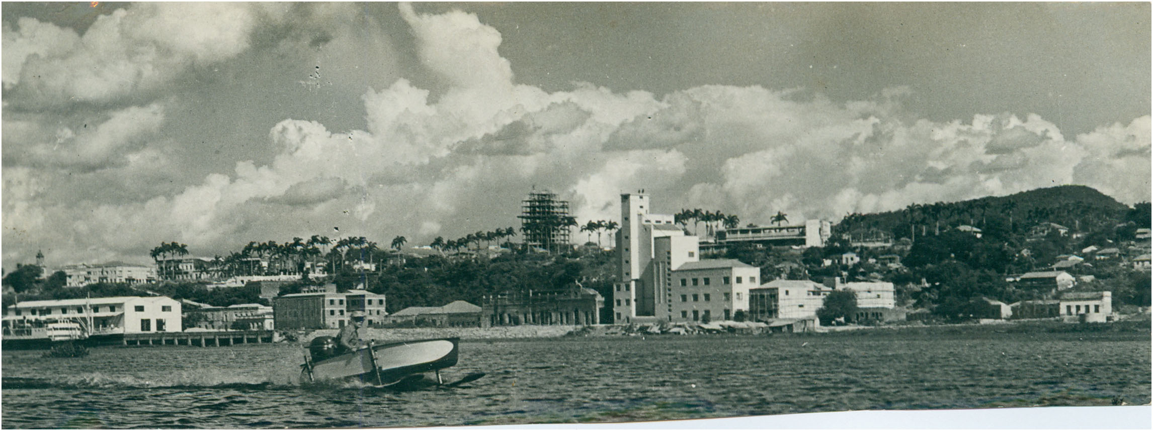 Inscrição na foto: O Rio Paraguai é motivo de atração dos filhos de Corumbá, que aproveitam suas águas para a prática dos mais variados esportes náuticos. Da direita para a esquerda aparece, ainda, na foto: o edifício do Moinho de Trigo de Corumbá, o da Alfândega e os armazéns do Porto. Ao fundo, o arcabouço do edifício “Tupi”, de 9 andares.