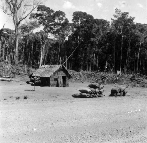 Título: Sacos de carvão, casas de sopapo coberta de palha e derrubada na estrada para Abunã em Porto Velho (RO)