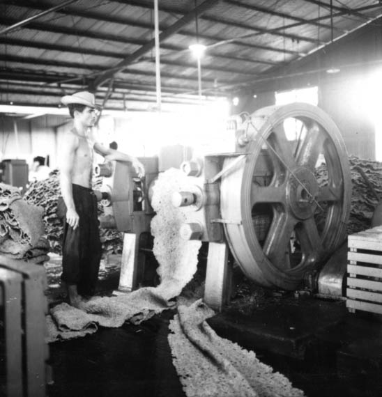 Título: Interior da Companhia Nacional de Borracha vendo-se a borracha saindo da máquina em Manaus (AM)