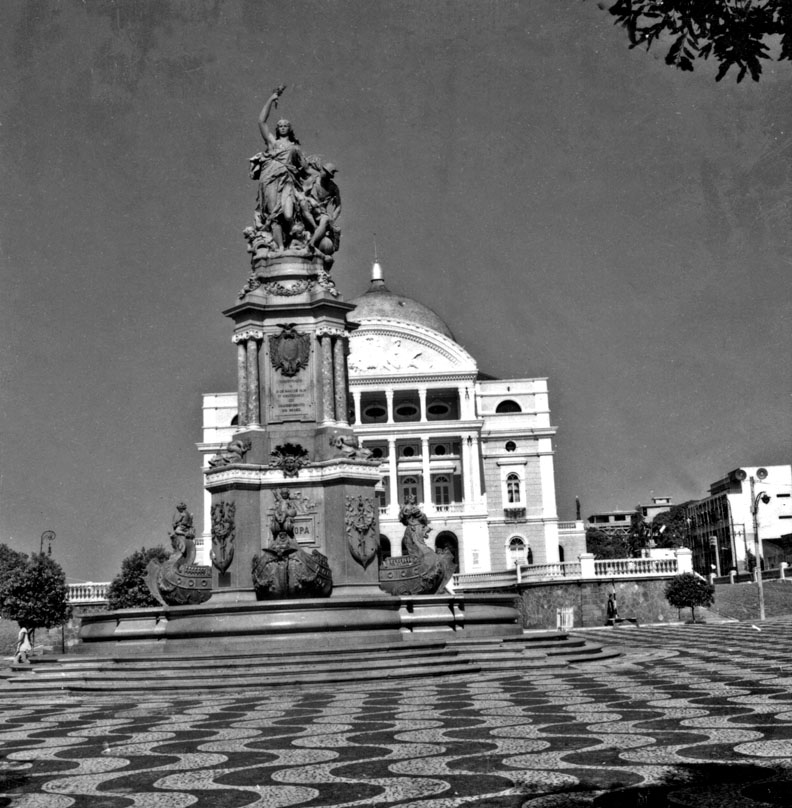 Título: Monumento á abertura dos portos e atrás fachada do Teatro Amazonas em Manaus (AM)